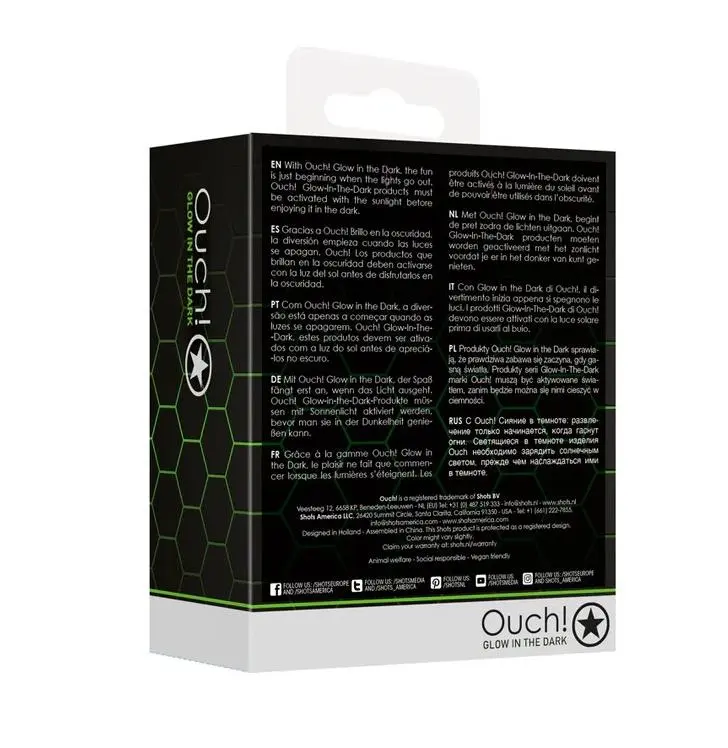 Ouch! Glow in the Dark, fremtiden for bondage er her. Designet med en autentisk bondage-estetikk, men med den ekstra gleden av selvlysende egenskaper, vil de fluorescerende grønne detaljene gjøre enhver begivenhet til en fest. Med Ouch! Glow in the Dark begynner moroa bare når lysene slukkes. Er det orgasmisk anal action du leter etter? Denne selvlysende glass-buttpluggen lover å ikke skuffe. Slapp av og nyt noe av den mest givende bakdørsgleden i livet ditt, enten det er alene eller med lekekameraten din. Bare smør deg inn med glidemiddel, så er du klar. Ouch! Glow-In-The-Dark-produktene må aktiveres av sollyset før du kan nyte dem i mørket.