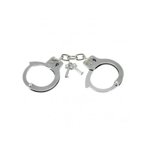 Håndjern av høy kvalitet i solid metall med tre koblingslenker og to nøkler. De er laget av solid stål og er ikke fleksible. Disse håndjernene kan kun åpnes med nøklene.