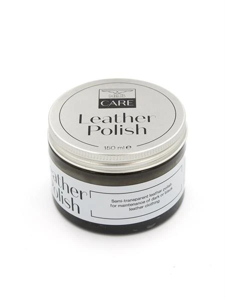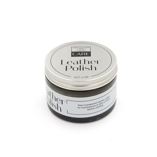 Mister B Care Leather Polish er en halvtransparent svart polish som fungerer veldig bra på svarte eller mørkere fargede skinnplagg, men det anbefales ikke å bruke den på hvite eller lettere fargede skinn.