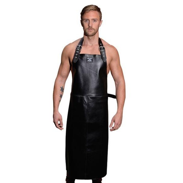Mister B LEATHER-forkle er laget av svart skinn av høy kvalitet. Juster metallspennene rundt halsen og midjen for en mer løs eller tett passform.