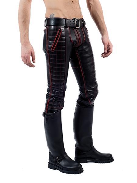 Mister B Indicator-jeansene med røde sømmer og kantbånd er en av de nyeste og mest forseggjorte skinnbuksene de noensinne har laget. Håndlaget i deres skinnverksted av sterkt, men likevel smidig 100 % anilin fullnarvet kuskinn. Hovedtrekket ved disse fantastiske skinnjeansene er polstrede og sydde lapper på bryststykket (som automatisk trekker blikket til skrittet), på venstre og høyre forside og på rumpesalen.