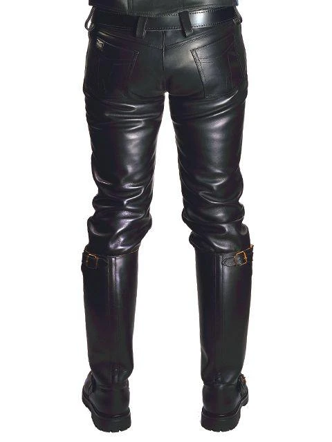Mister B Jeans er faglig håndlaget individuelt i deres lærverksteder. De har en ganske lav midje og er designet for å sitte tett rundt baken og øvre del av benet. Ideelt sett bør de være litt for stramme når du får dem, fordi når du bruker dem inn, strekker læret seg og blir enda mer smidig. Når de er brukt inn, vil et par Mister B lærbukser vare veldig lenge uten å bli slappe, fordi læret vi bruker er solid nok (1,0 – 1,1 mm).