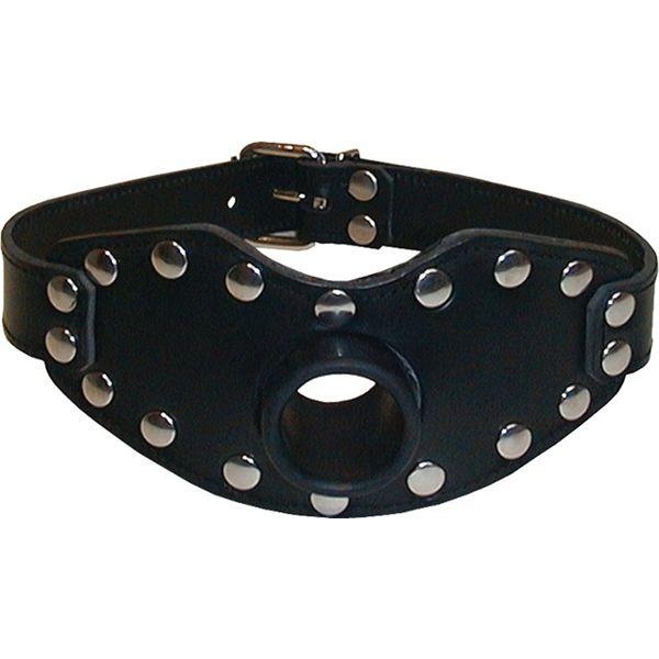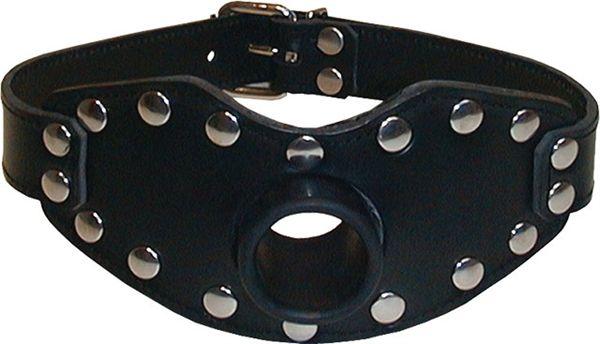 Piss Gag med Strap-on i kraftig lær. Røret er laget av gummiert plast. Den utvendige diemateren på røret er ganske stort – 40 mm. Slaven vil garantert gape etter gylden glede.