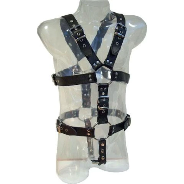 Den fullstendige kroppsversonen av Mister B The Bear Top Harness. Denne versjonen er laget av 5 cm brede remmer av mykere skinn som er brettet, foret og deretter sydd (noe som er veldig arbeidskrevende). Justerbar med spenner. Harnessen kommer med en standard 55m kukring i metall, denne er avtagbar så du kan bytte den ut med din favoritt kukring