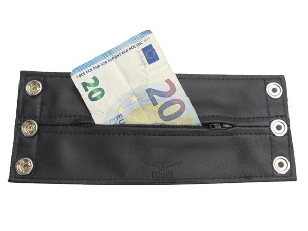 En Mister B håndleddslommebok med glidelås er et armbånd og en lommebok i ett. Håndlaget av jeansskinn og fôret på innsiden, er disse lommebøkene ideelle for å oppbevare festpenger eller drikkekuponger når du skal på byen eller på fest.