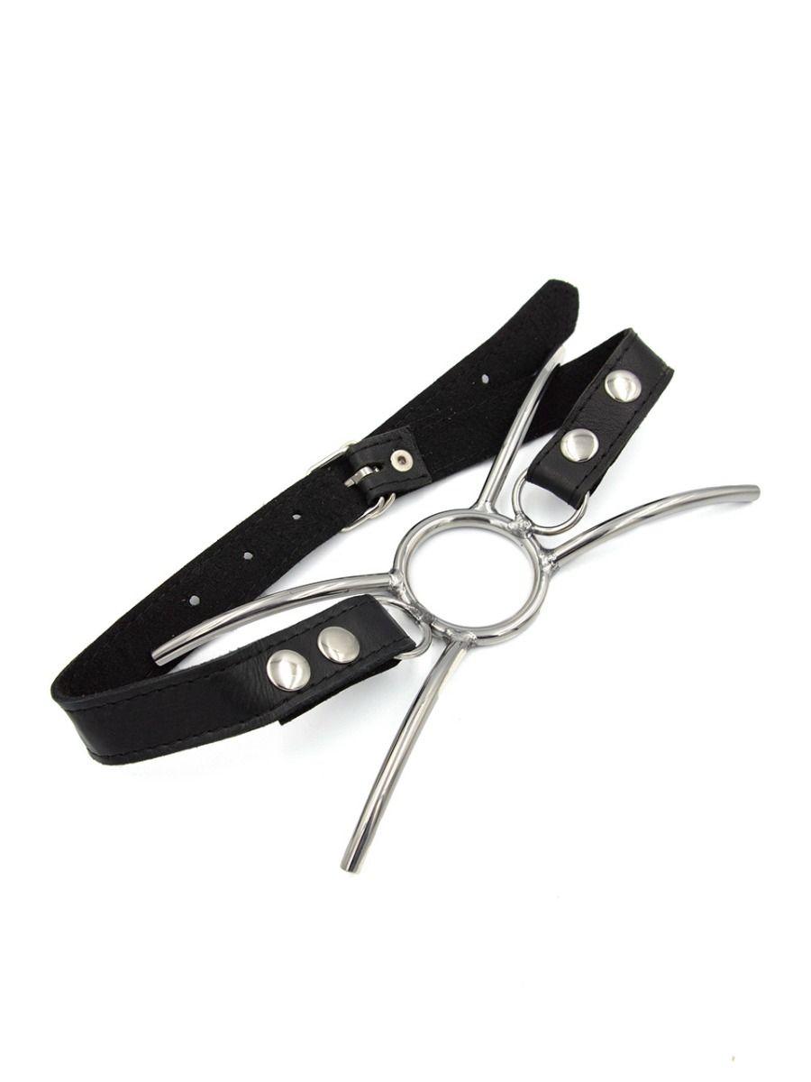 Når vidåpen ikke er vidt nok, vil denne spider gag-en virkelig gjøre jobben! Denne ekstreme gag-en består av en stålring med fire buede metallben festet til ringen. Gag-en og bena forhindrer munnen fra å lukkes, og holder munnen vidåpen for hva enn du ønsker å putte inn.