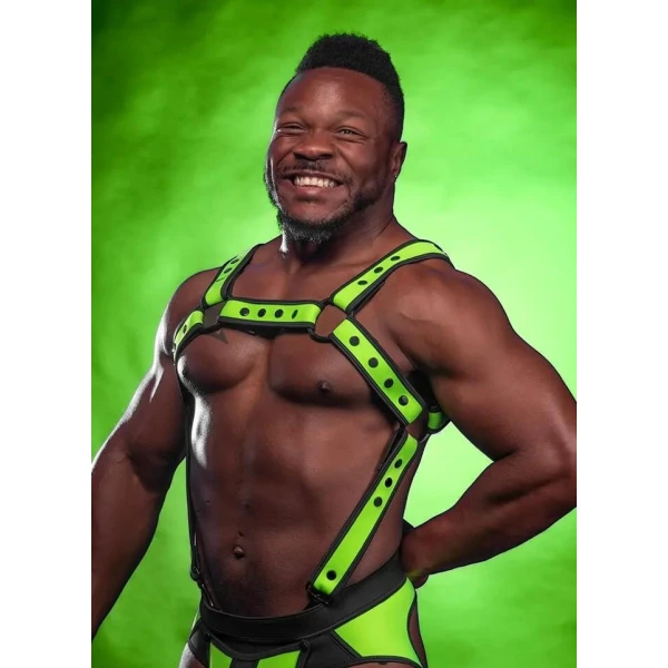 Neo Bold Color Bulldog-sele har 1 ½ tomme tykk, myk matt neopren med kontrasterende nylon/spandex kantbånd. To sidestropper med klipsender gjør det mulig å feste selen til beltehemper eller d-ringene på dine favoritt jockstraps. Selen er enkel å justere med brukervennlige, svarte plastspenner, og det svarte utstyret får de fargede neoprenmaterialene til å skinne.