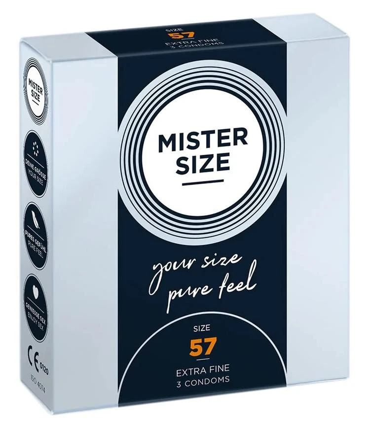Det føles bare riktig når det passer! Tenk på det: Alt du tar på kroppen din – fra hansker til luer til jakker – er perfekt designet for størrelsen din. Og nå er kondomet ditt også det. Med et spesialtilpasset MISTER SIZE-kondom vil du føle alt og ikke frykte noe! Kondomstørrelse, perfekt tilpassede kondomer – det er egentlig ikke noe vi tenker eller snakker om. Svært ofte vet man ikke hva riktig kondomstørrelse er. Det finnes heller ikke mye hjelp på markedet for å informere om riktig kondomstørrelse. Å ta på feil kondomstørrelse kan føre til at kondomene glir, sprekker, matt følelse og fremfor alt mangel på nytelse. I tillegg varierer kondomene som er tilgjengelige på markedet for tiden betydelig i tekstur, smak og form. Men de varierer knapt i størrelse. Kondomstørrelsen er egentlig ikke nevnt, kanskje fordi bredden varierer mellom 52 og 56 mm. Bare noen få kondomer er tilgjengelige i størrelse 57 mm, en kondomstørrelse som allerede regnes som veldig stor. Men hvis vi ser på nyere studier av erigert penisstørrelse, fant vi at bredder på 58–61 mm faktisk var gjennomsnittsstørrelsene. MISTER SIZE – 7 kondomstørrelser for perfekt passform! Gir bedre komfort, sikkerhet og følelse!