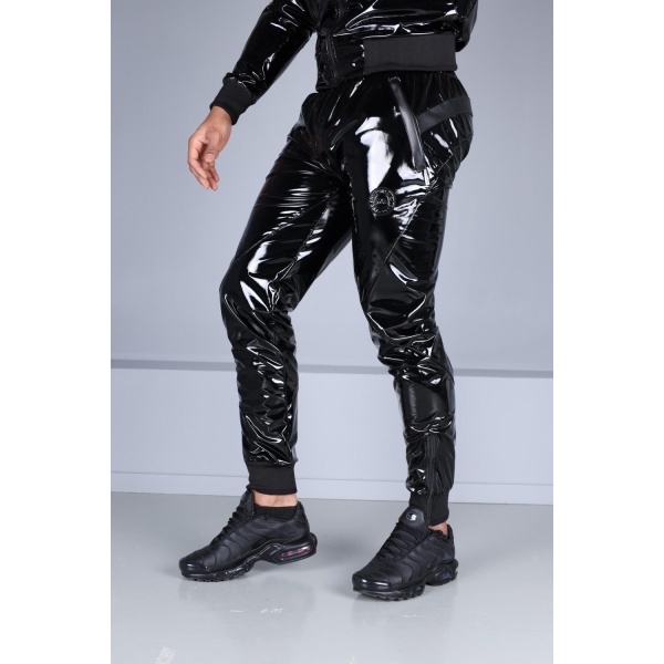 – Skinnende svarte PVC Tracksuit Pants med diagonale seksjonsdetaljer på bena.