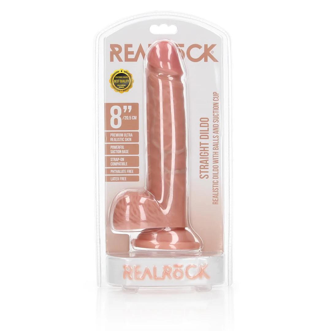 RealRock er designet for å la deg kose deg til det fulle. En fast og myk dildo som ser naturlig ut og har akkurat passe størrelse. I kombinasjon med de realistiske årene på skaftet, som gir ekstra stimulering på innsiden, er dette en dildo som du sent vil glemme på nattbordet. Denne realistiske dildoen er helt rett for dyp penetrasjon. Pungen og velformet glans er detaljene som gjør bruken av denne dildoen så naturtro. Sugekoppen tillater solid håndfri bruk (på en glatt overflate), og gir også muligheten til å bruke denne RealRock i en sele. Med alle disse alternativene vil du få en eksplosiv orgasme som ikke vil mangle noe.
