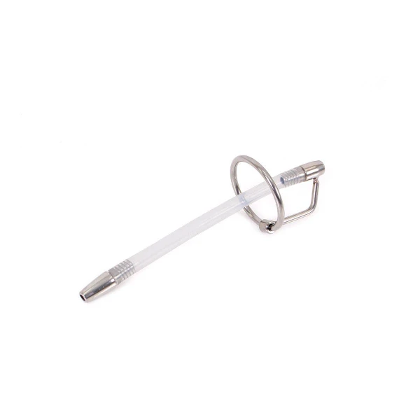 Dette mellomstore urinrørskateteret har en tupp av rustfritt stål med en diameter på 8 mm og en lengde på 12,8 cm, etterfulgt av en gjennomsiktig silikonslange som avsluttes med en glansring i stål. Den leveres med to glansringer i størrelsene 25 mm og 32 mm i indre diameter, slik at den passer de fleste.